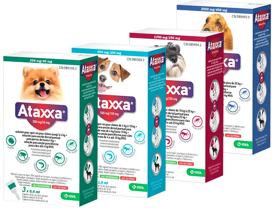 Reducción del riesgo de infección por Leishmania infantum a través de la transmisión de flebotomos (Phlebotomus perniciosus) durante un periodo de hasta 3 semanas. El efecto es indirecto debido a la actividad del medicamento veterinario contra el vector.