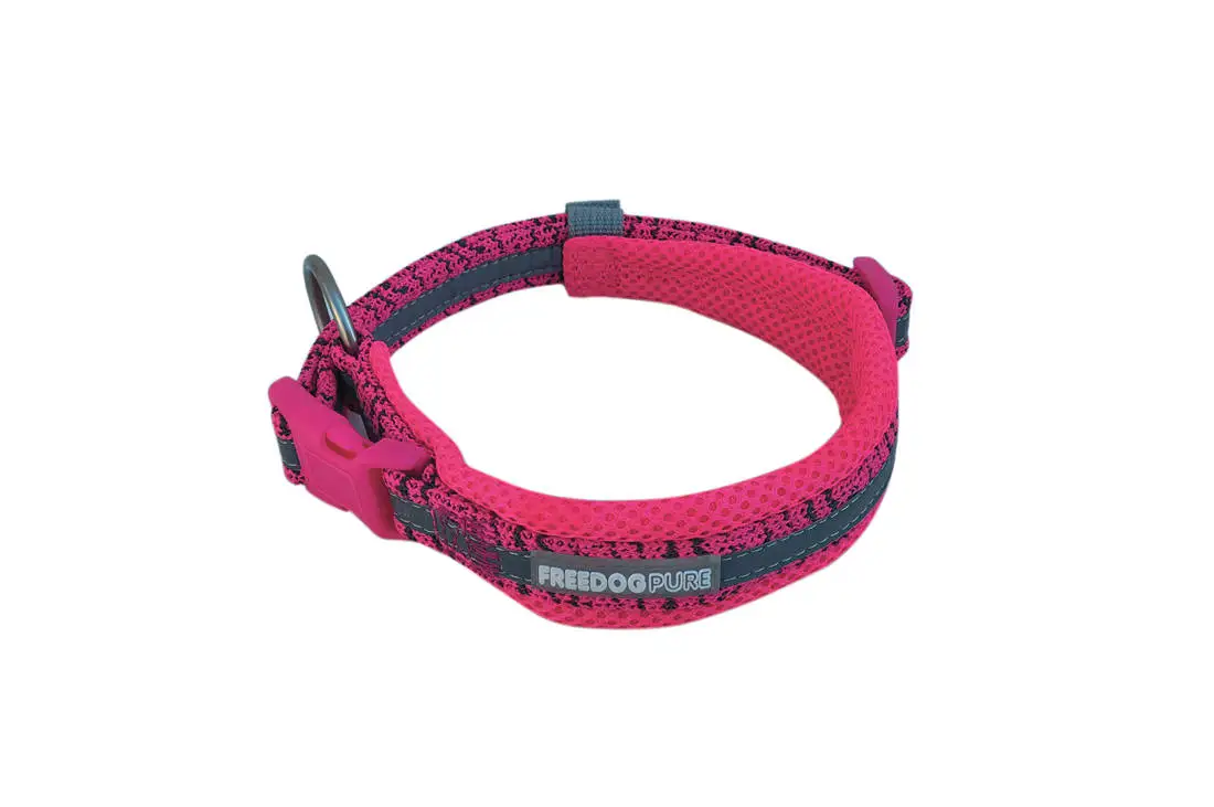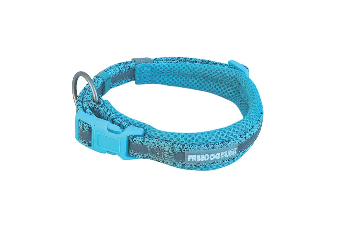 Collar fabricado con materiales de alta calidad, acolchado en el interior y transpirable. Es reflectante 360º. Anilla metálica con acabado perla. Lavable a máquina y ajustable al cuello. Disponible en diferentes tallas y colores.